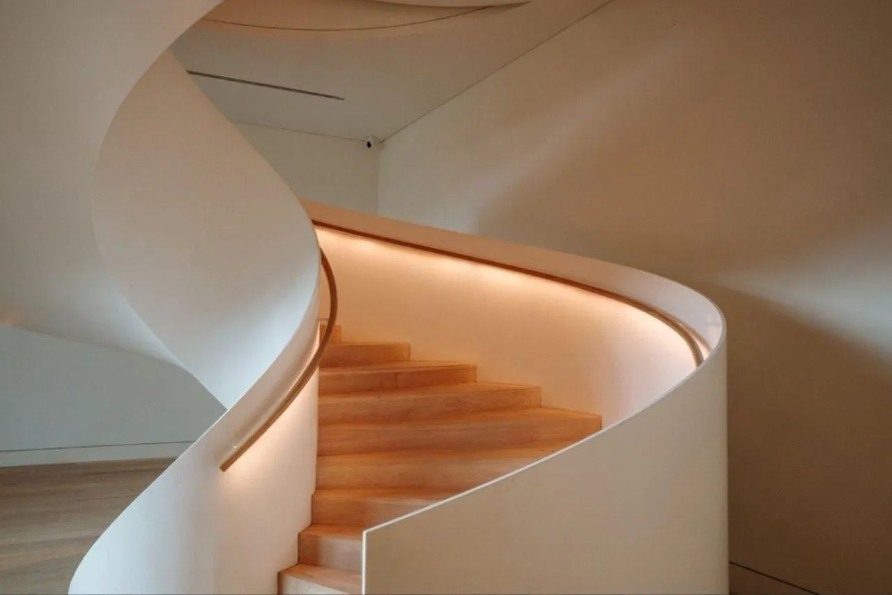 Когда лестница перестает быть просто способом перемещения и превращается в произведение искусства, интерьер обретает душу. Этот проект — воплощение смелой дизайнерской мысли: сложная геометрия, напоминающая застывшую в движении ленту, стала центральной осью всего пространства. Гармоничное сочетание теплых деревянных ступеней и футуристичной подсветки поручней создает поистине статусный и незабываемый образ.